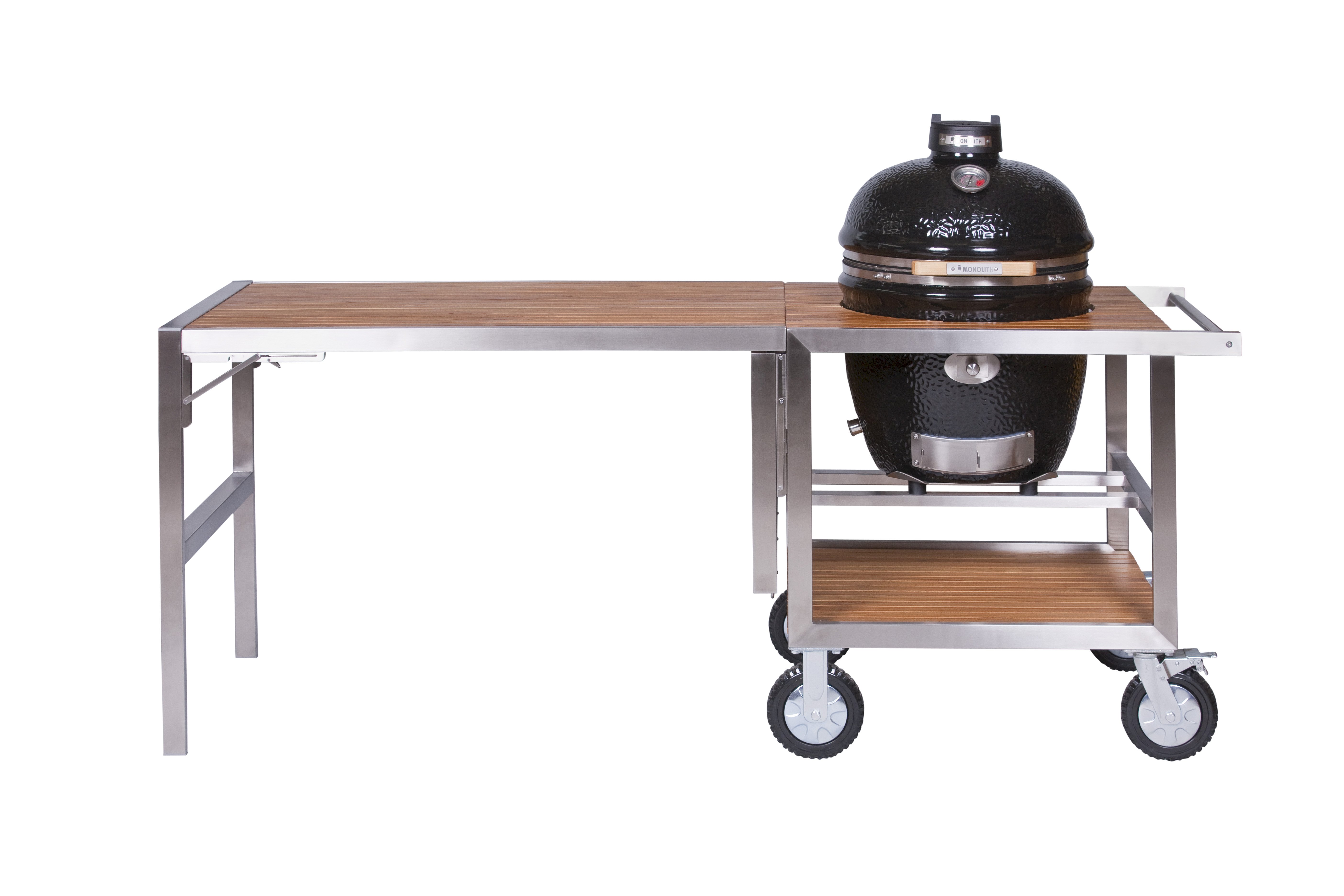 Buggy* pre gril Monolith Classic a Le CHEF je skladací príručný vozík s bočným stolíkom. Bočný stolík sa jednoducho pripevní k vozíku. Tak sa rozšíri pracovná plocha dodatočne o 126 x 80 cm. Stôl má nerezovú konštrukciu v kombinácii s drevom z agátu. Rovnako ako pracovný priestor môže byť táto časť ideálnym miestom pre menší Monolith ICON a teda poskytuje ešte viac grilovacieho priestoru a možností varenia. Keď sa stôl nepoužíva, dá sa ľahko uložiť a tým Vám šetrí miesto.